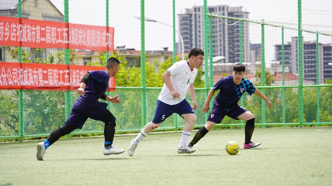 比赛现场紧张热烈,运动员们激烈拼抢、奋力拼搏,尽情发挥球技:抢断、过人、射门、扑救……双方比分你追我赶,局势瞬息万变,扣人心弦。场上,运动员们激烈角逐、挥洒汗水;场下,观众们掌声不断、欢呼雀跃,整场比赛充满运动激情,充分展现了威海职工的活力与风采。