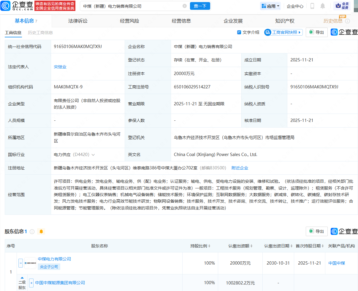 近日,中煤(新疆)电力销售有限公司成立,法定代表人为宋继业,注册资本为2亿元,经营范围包含:供电业务;发电业务、输电业务、供(配)电业务;储能技术服务;环境保护监测等。企查查股权穿透显示亚投金融,该公司由中国中煤旗下中煤电力有限公司全资持股。